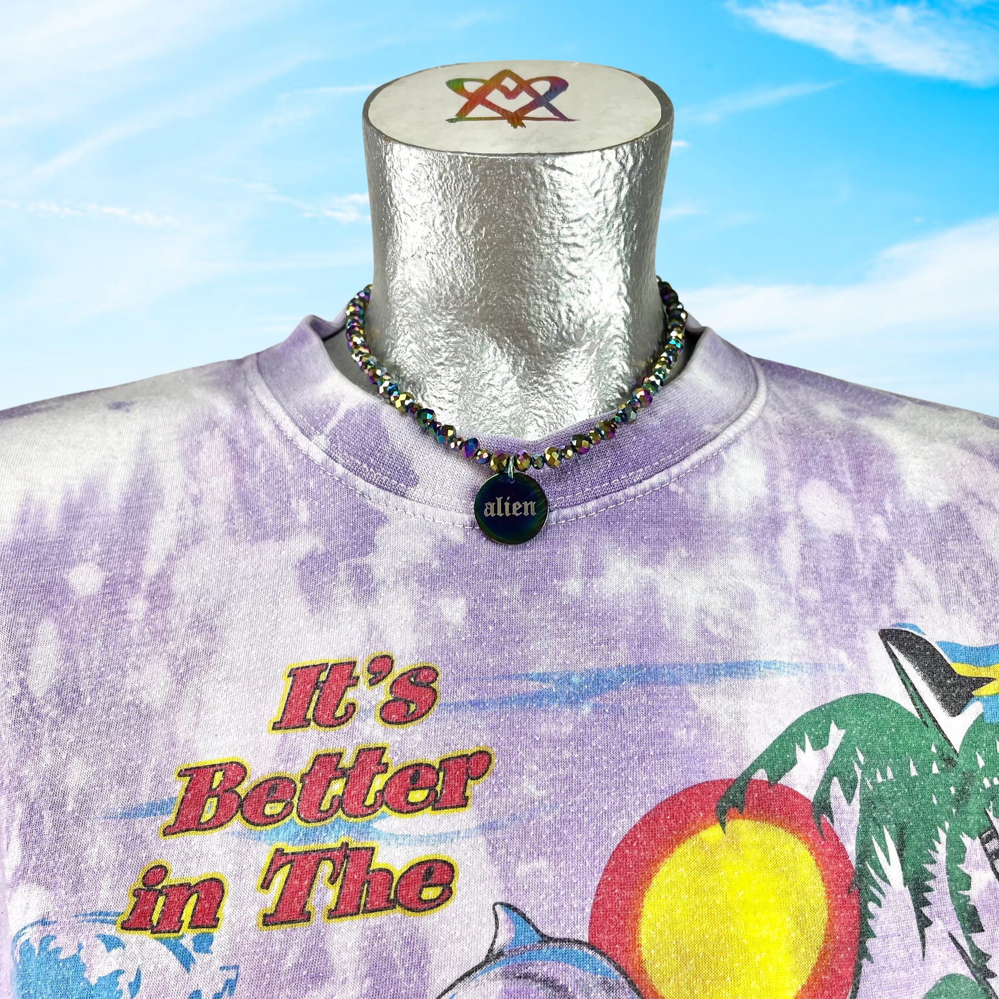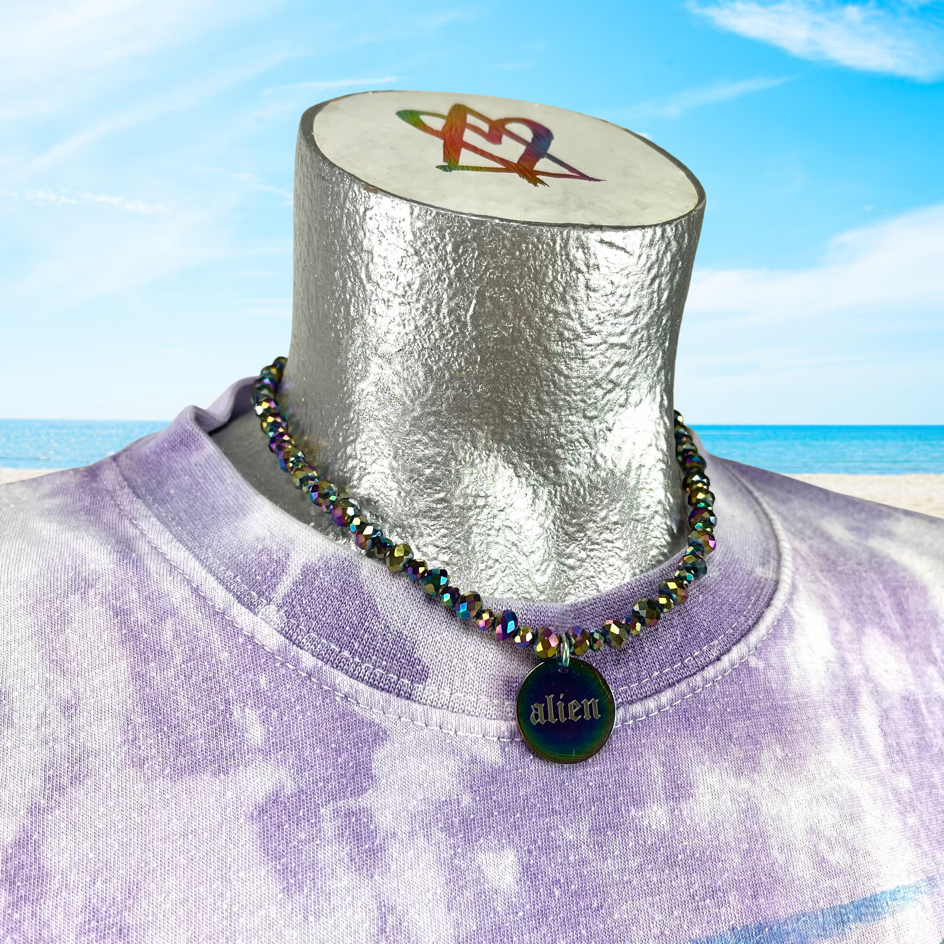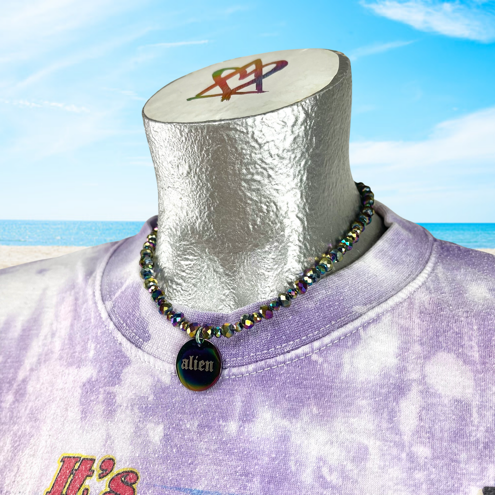 - Aurora borealis iridescent beads with stainless steel alien tag