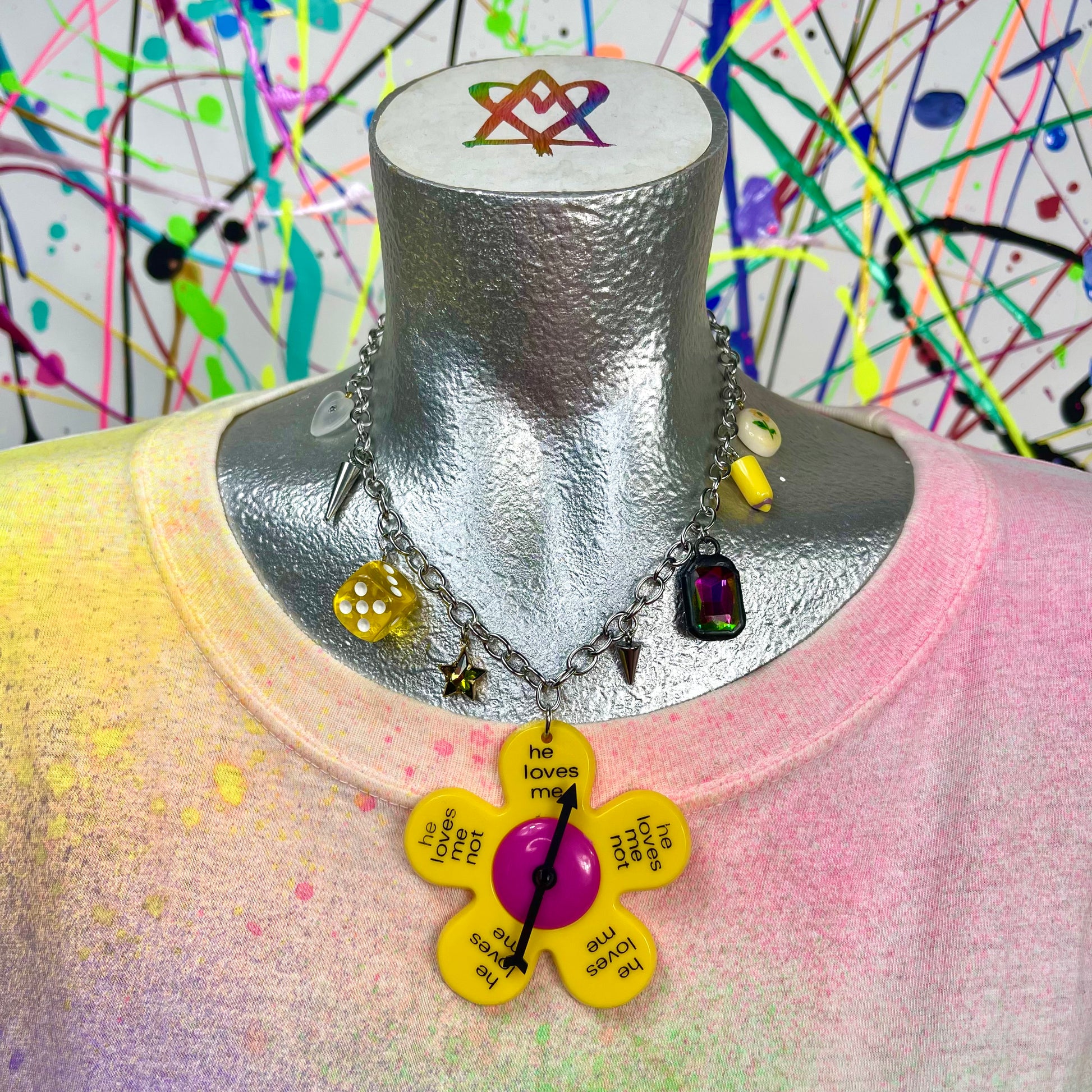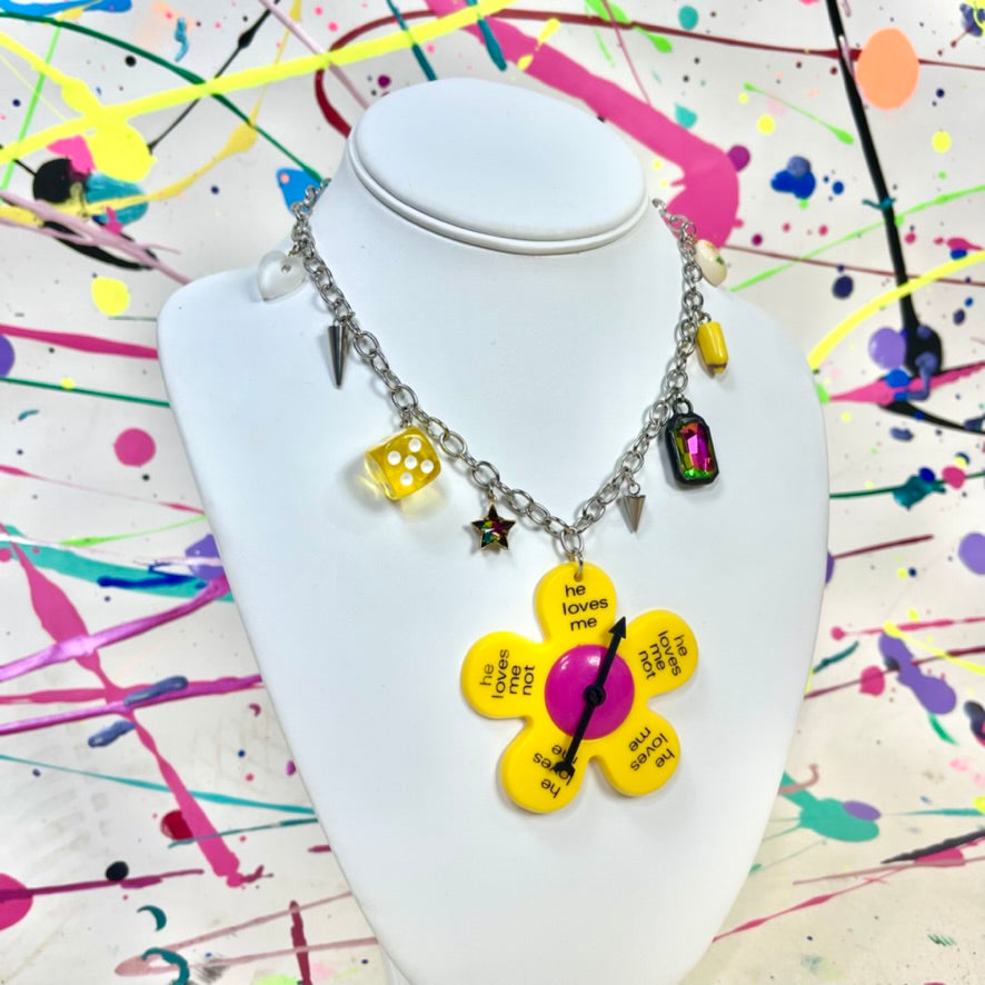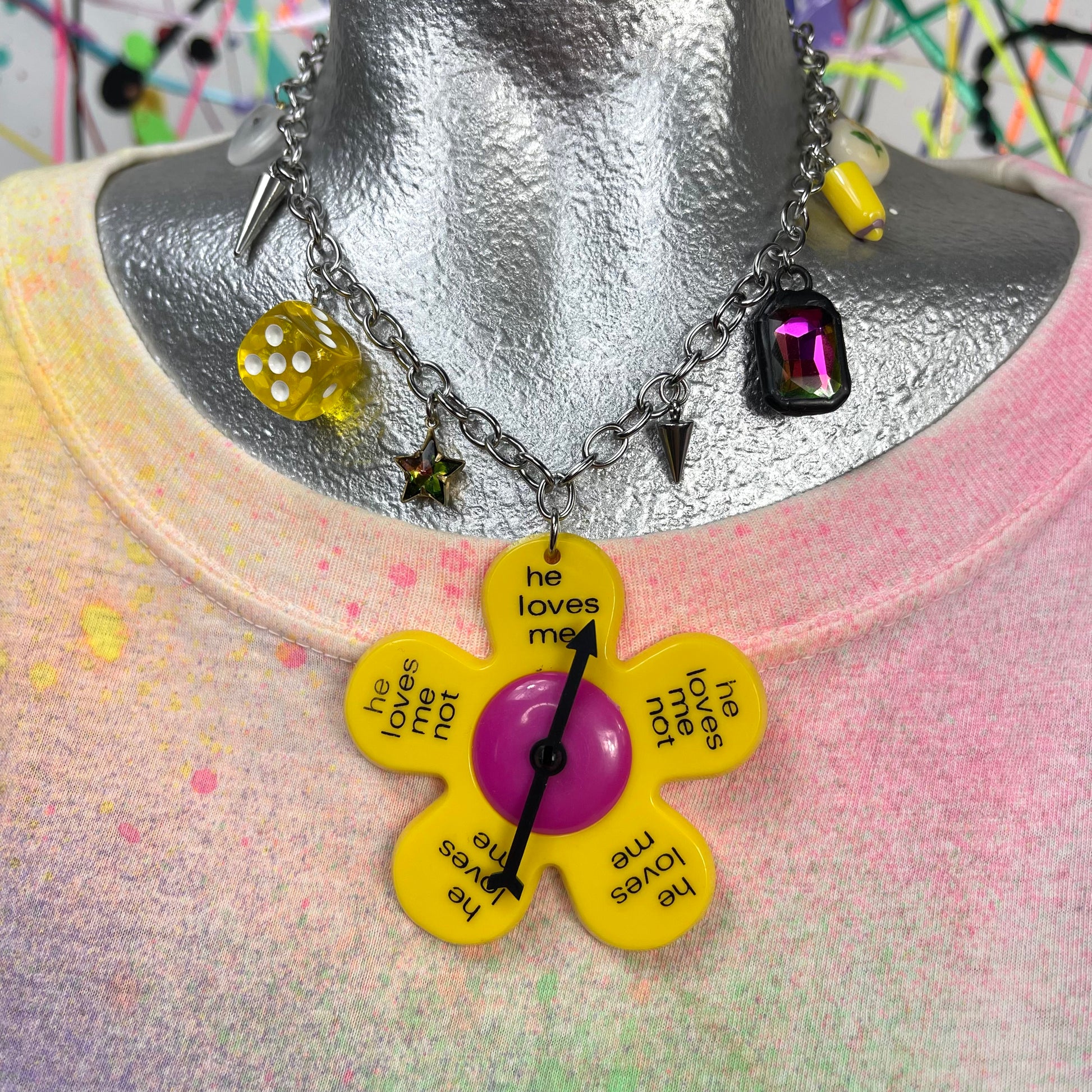 - Stainless steel chain featuring a large epic deadstock 1980's spinner flower with mixed charms. Charms include some vintage, new and stainless steel charms.