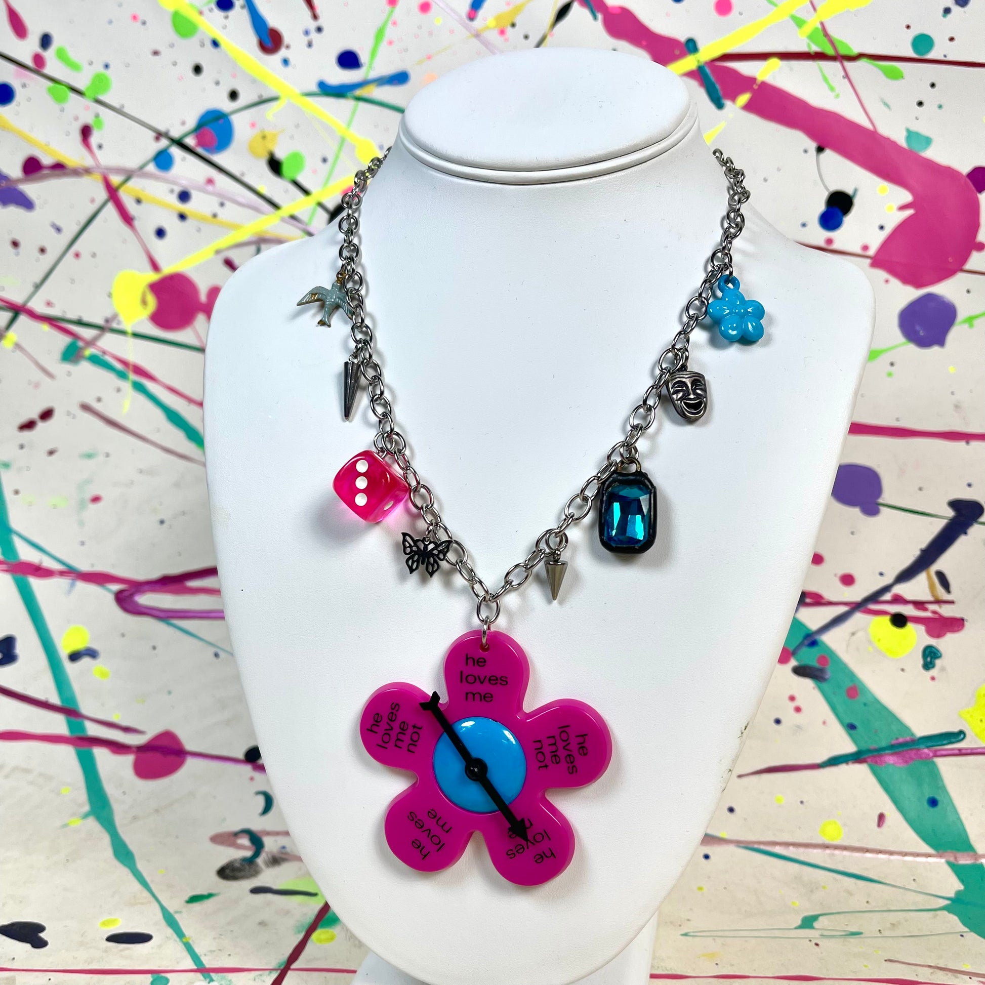 - Stainless steel chain featuring a large epic 1980's deadstock pink flower spinner with mixed charms, some vintage and some new