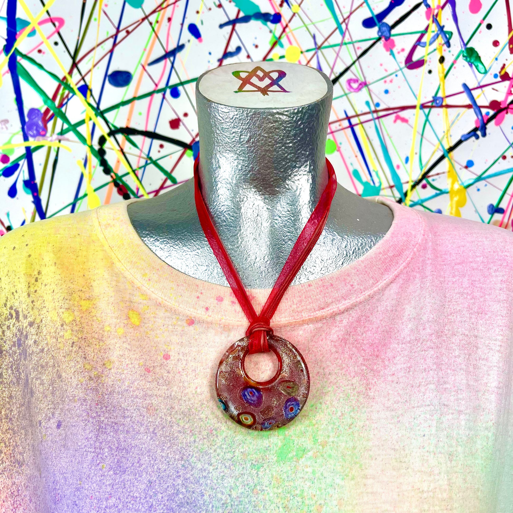 - Y2K millefiori glass pendant necklace on fabric cord
