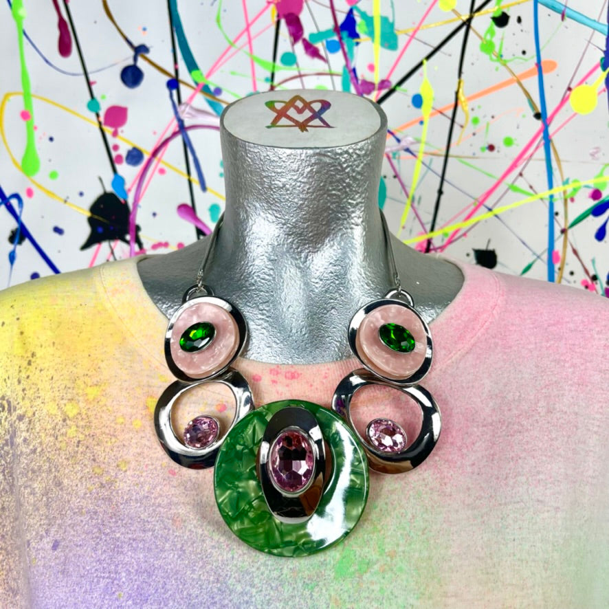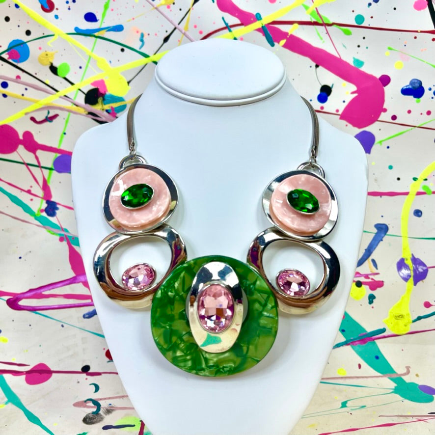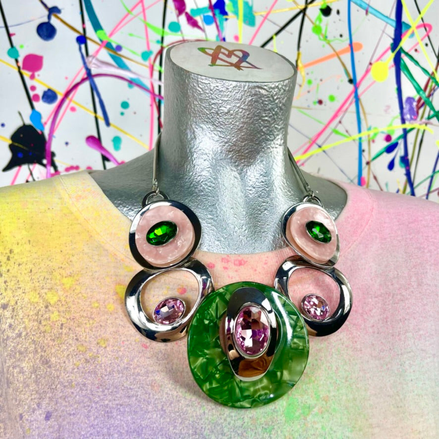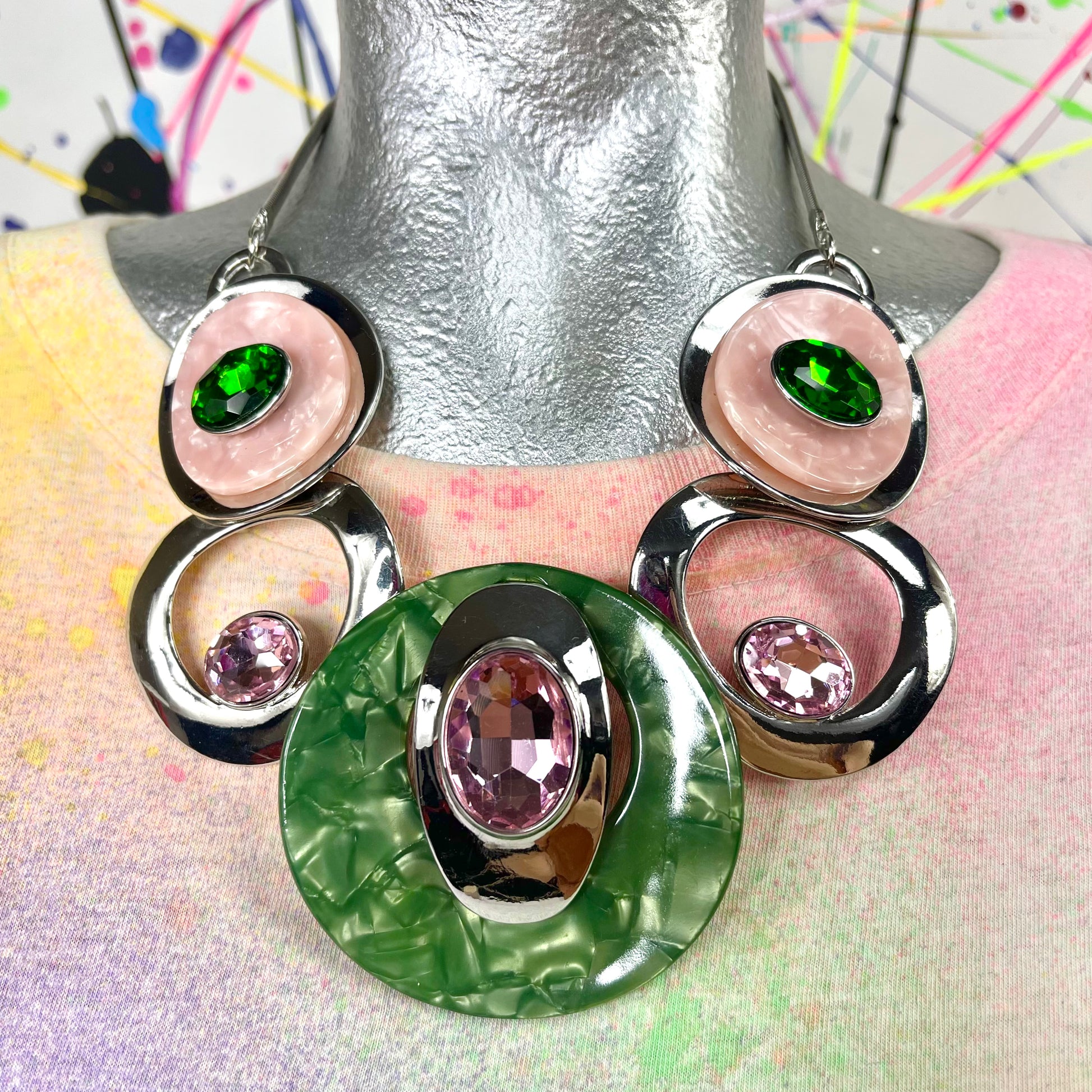 - Materials: silver tone snake chain, metal and glass rhinestones