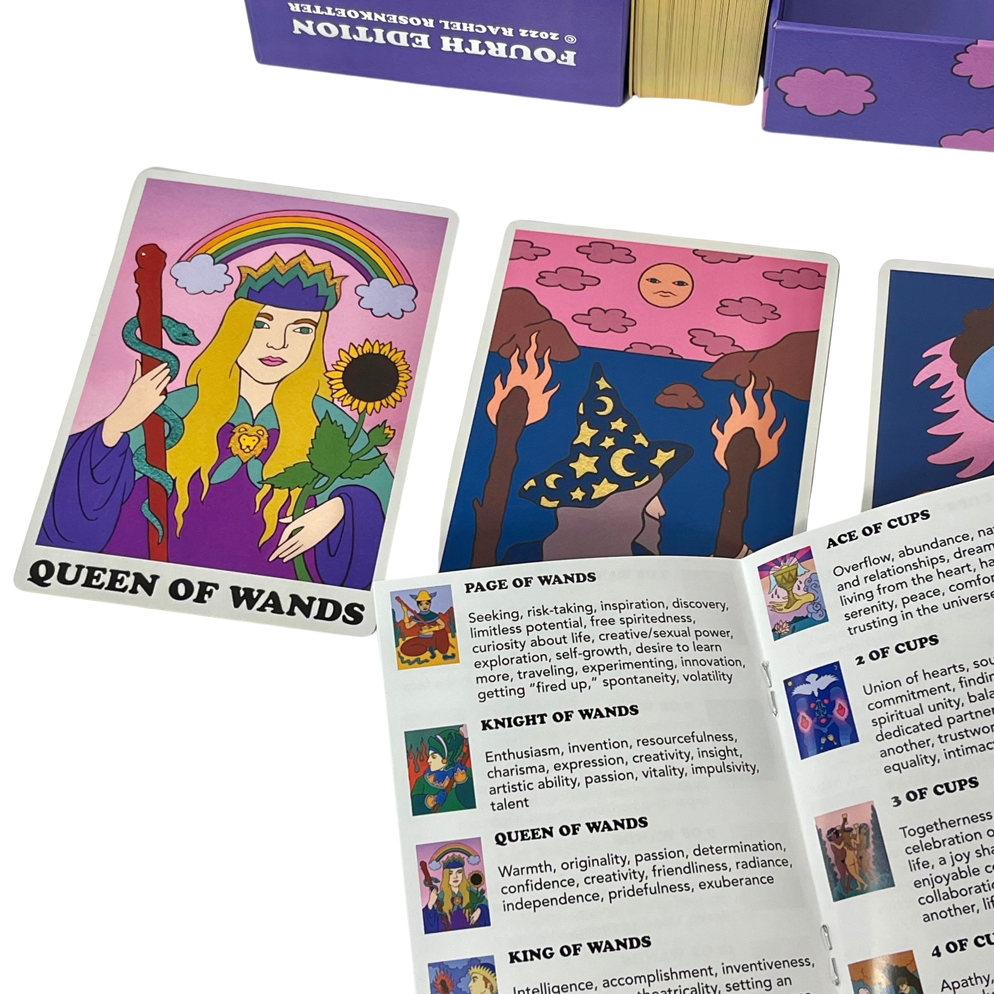 - 78 card indie tarot deck featuring colorful, retro-inspired illustrations painted with love in Portland. This 3.5x5" deck is printed on 400 gsm stock with a matte finish and holographic edges. The cards come in a fully lidded box packed with a 24 page full color booklet featuring succinct key words and interpretations for each card. Illustrated by hand by Rachel Rosenkoetter.