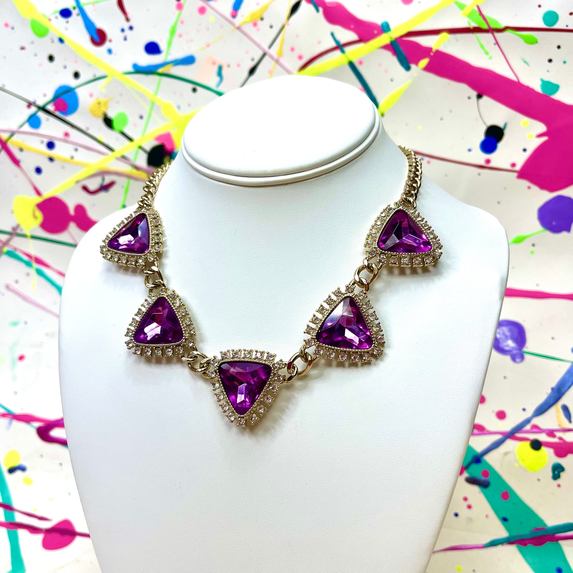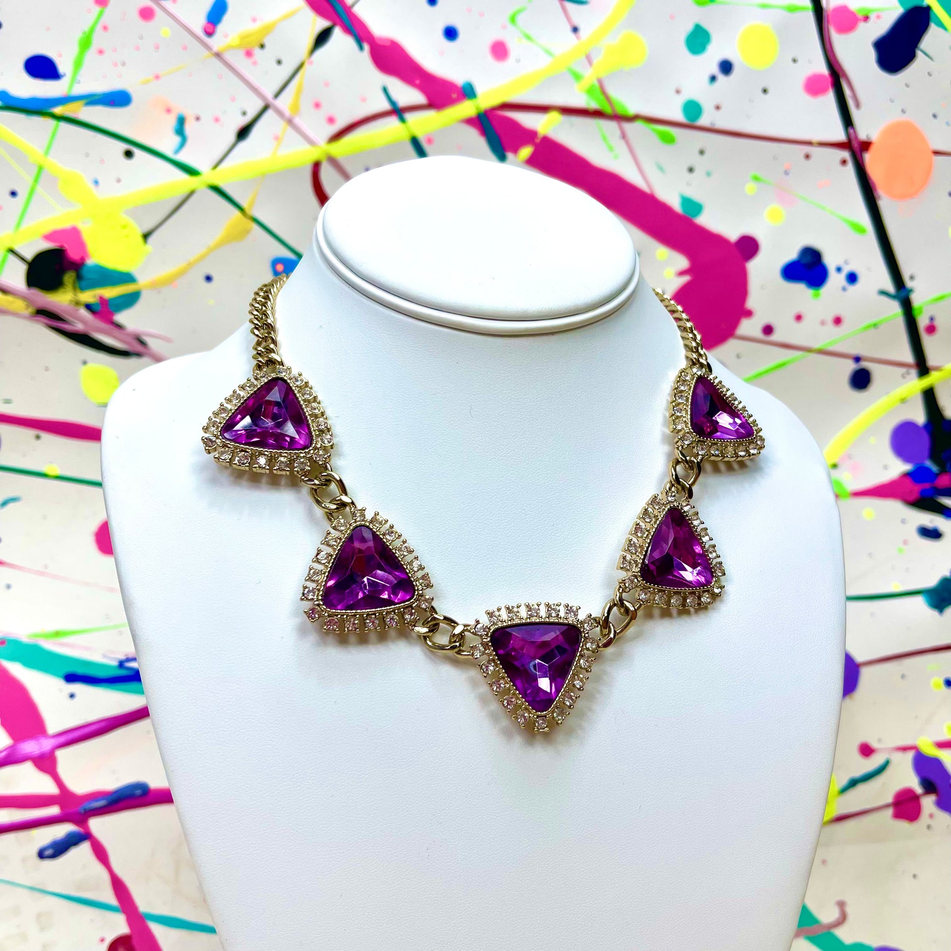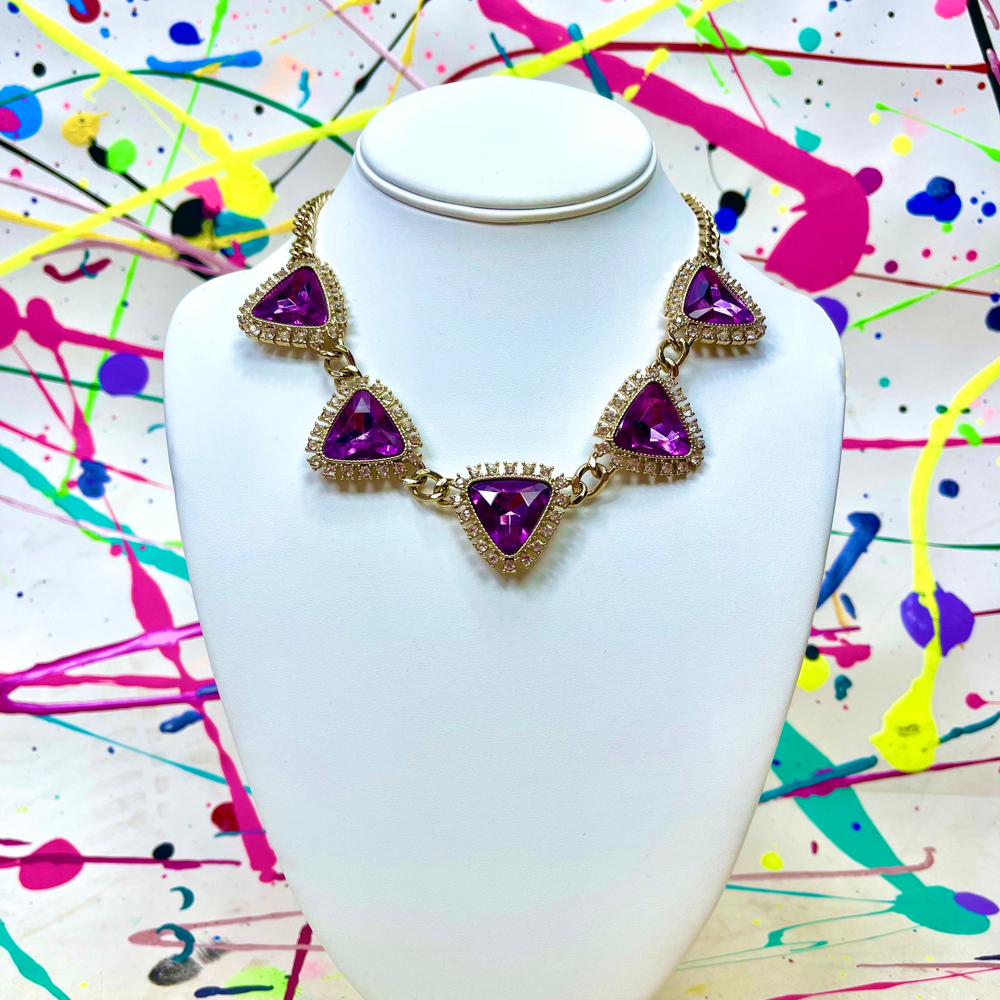 - Purple meets pink perfection with this triangular rhinestone necklace