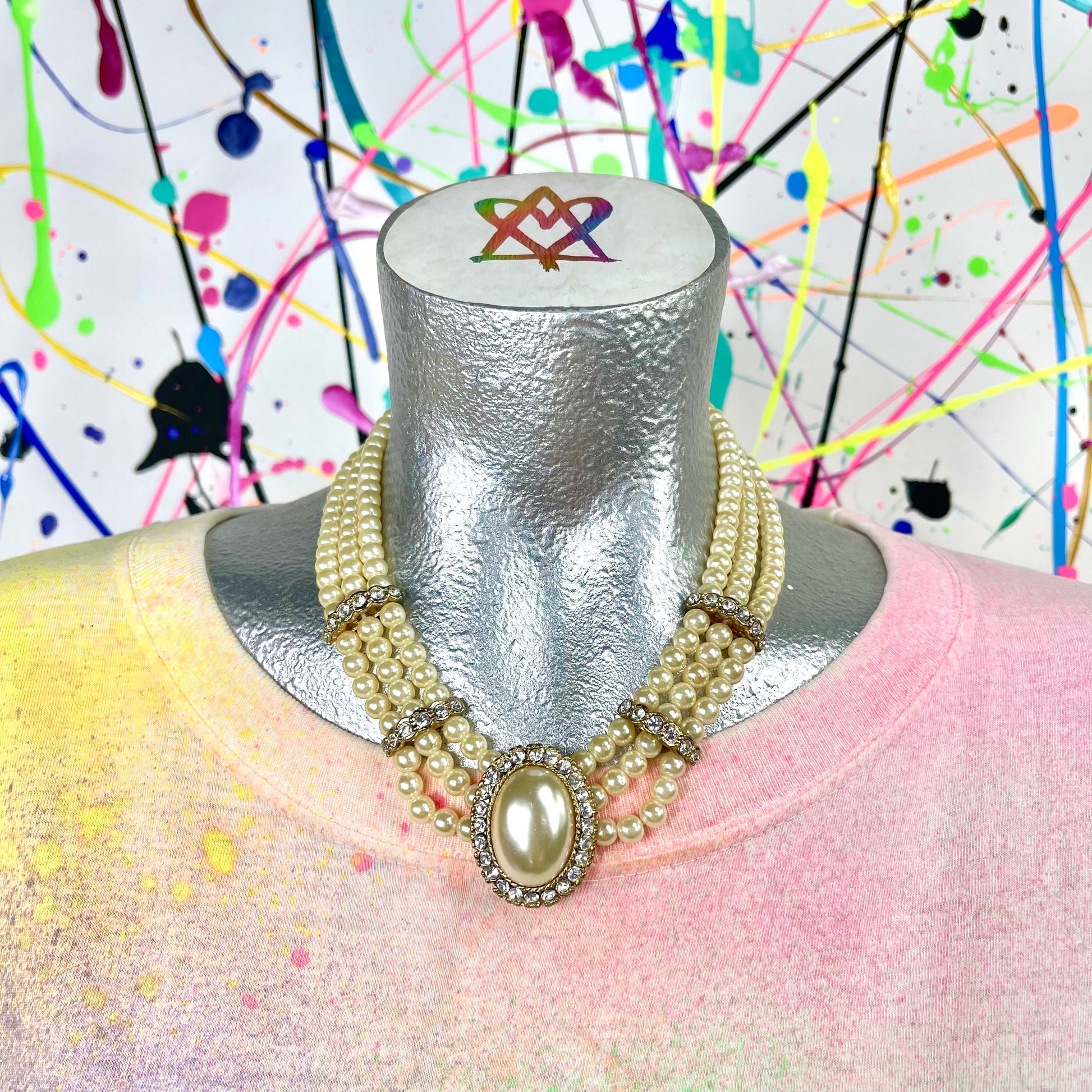- Vintage 3 strand pearl and rhinestone statement necklace